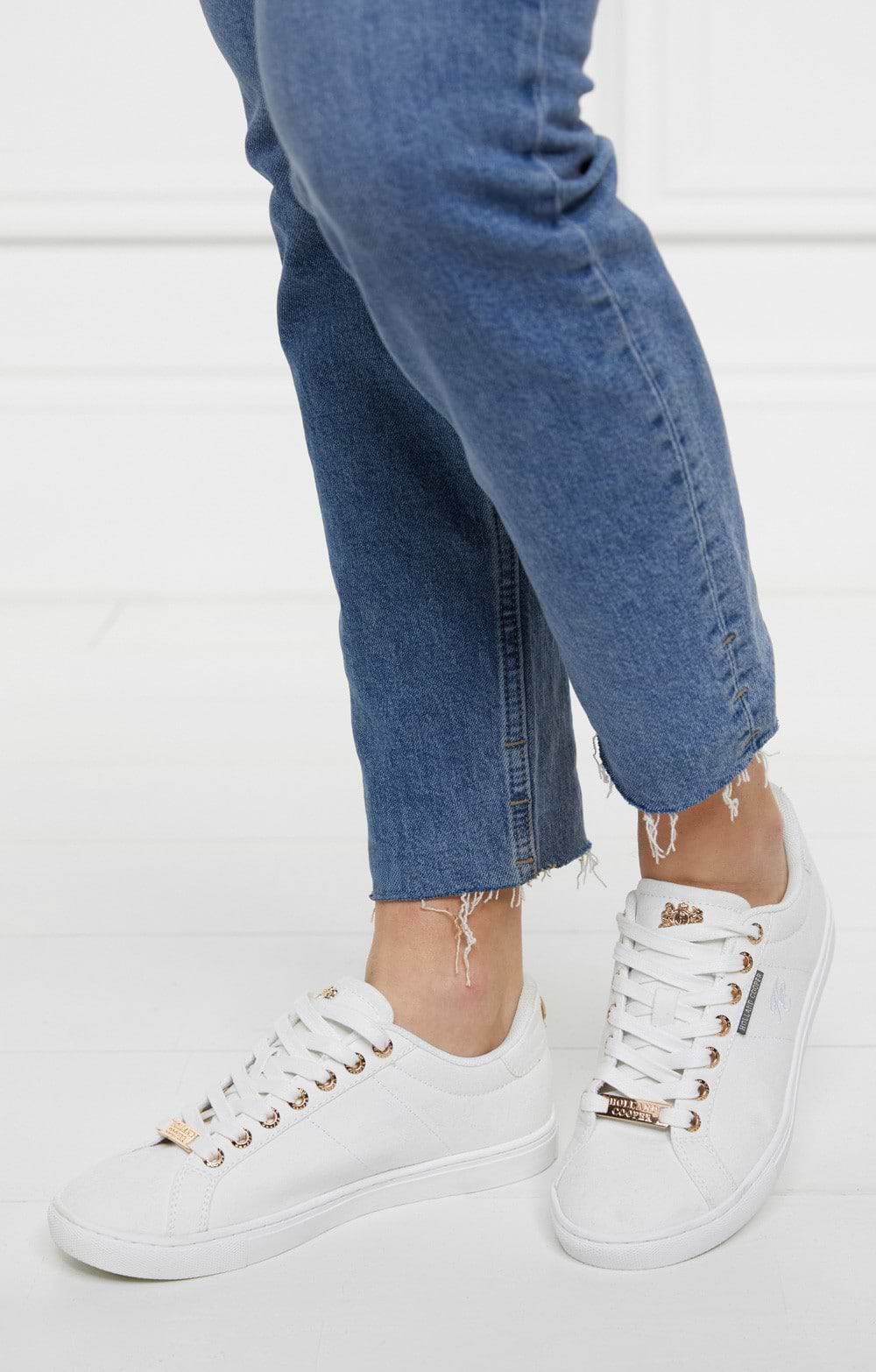 Designed for everyday wear, the ladies Holland Cooper Chelsea court trainers feature premium cotton canvas, gold hardware, and arch support for all-day comfort.