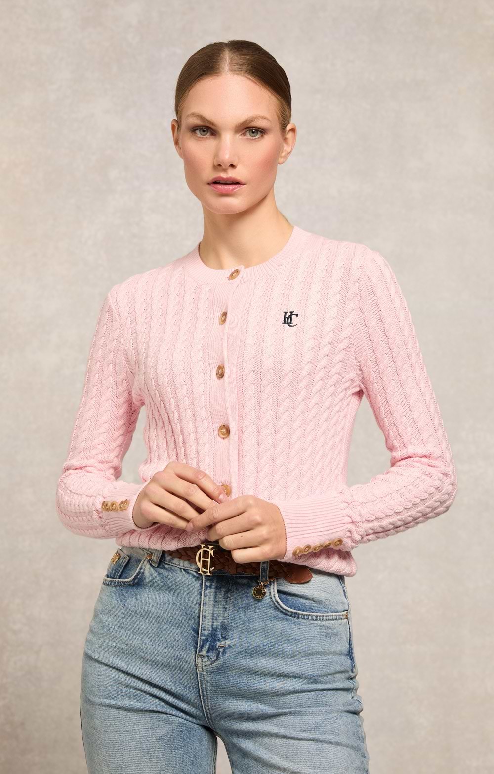 The ladies Cotswold cardigan features a cable knit design, horn button detailing and Holland Cooper embroidery, creating a refined, heritage-inspired look.