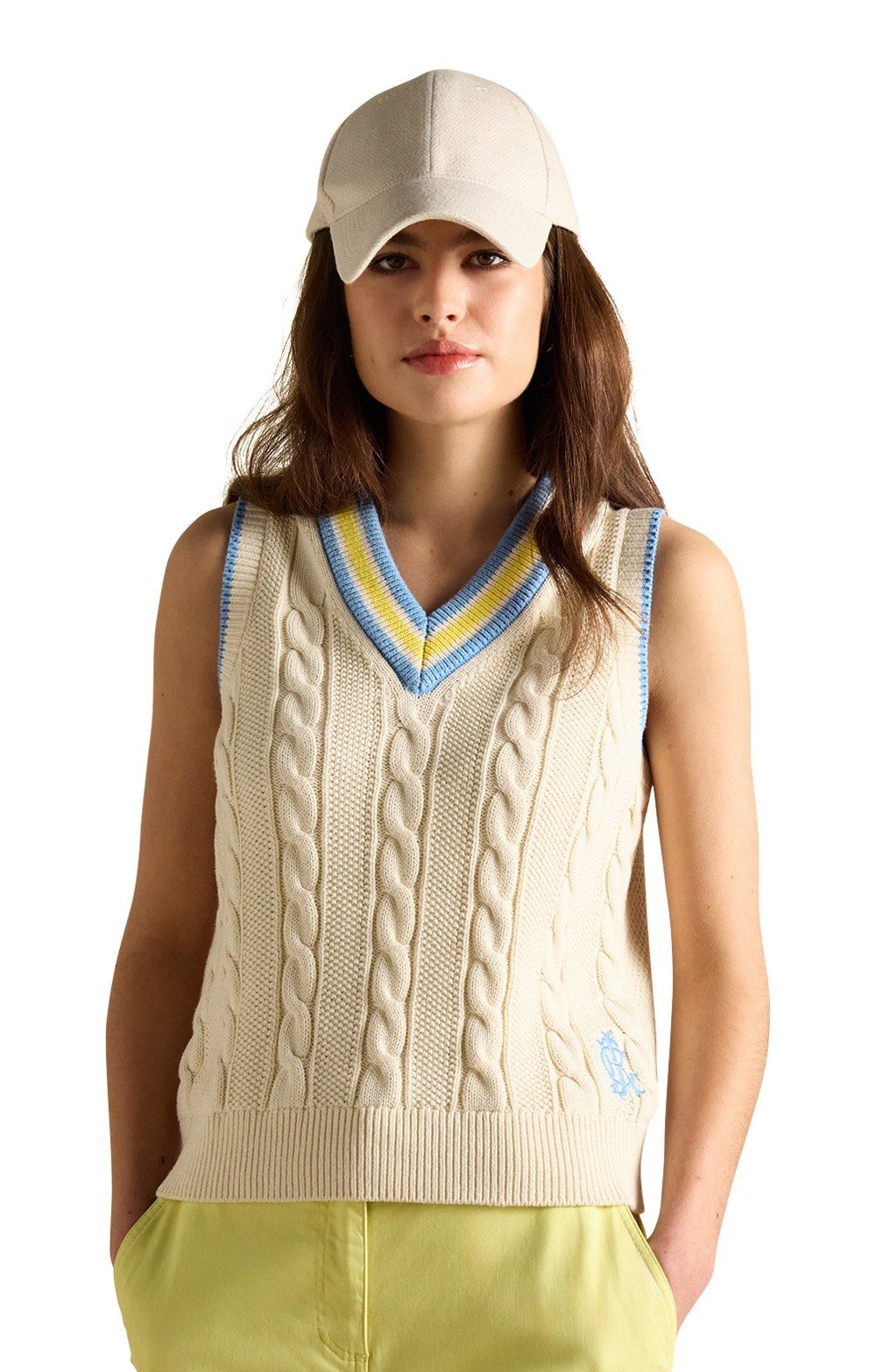 Cable knit frontMoss stitch detailingDeep V-neck with striped trimSleeveless designRibbed hemPair with a flowing midi skirt for a sophisticated touch or relaxed linen trousers for an effortless off-duty look.