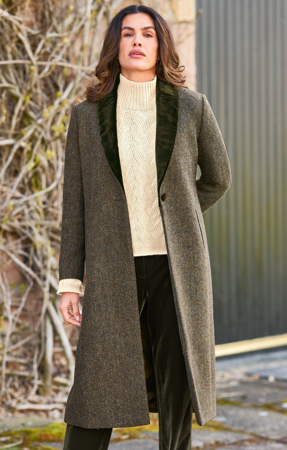 Full length coat.Long sleeves.Relaxed cut.Shawl collar in coordinated velvet.Single button fastening with velvet button.Velvet edged jet pockets.House of Bruar satin lining.Designed by The House of Bruar.A true style investment, this piece is smart enough to wear over a suit or dress for a country wedding, but will also look effortlessly stylish teamed with a chunky knit jumper and wide leg trousers.
