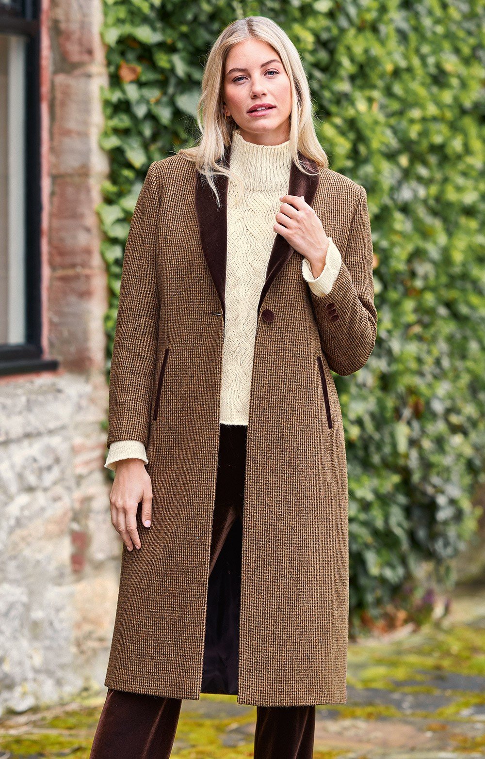 Full length coat.Long sleeves.Relaxed cut.Shawl collar in coordinated velvet.Single button fastening with velvet button.Velvet edged jet pockets.House of Bruar satin lining.Designed by The House of Bruar.A true style investment, this piece is smart enough to wear over a suit or dress for a country wedding, but will also look effortlessly stylish teamed with a chunky knit jumper and wide leg trousers.