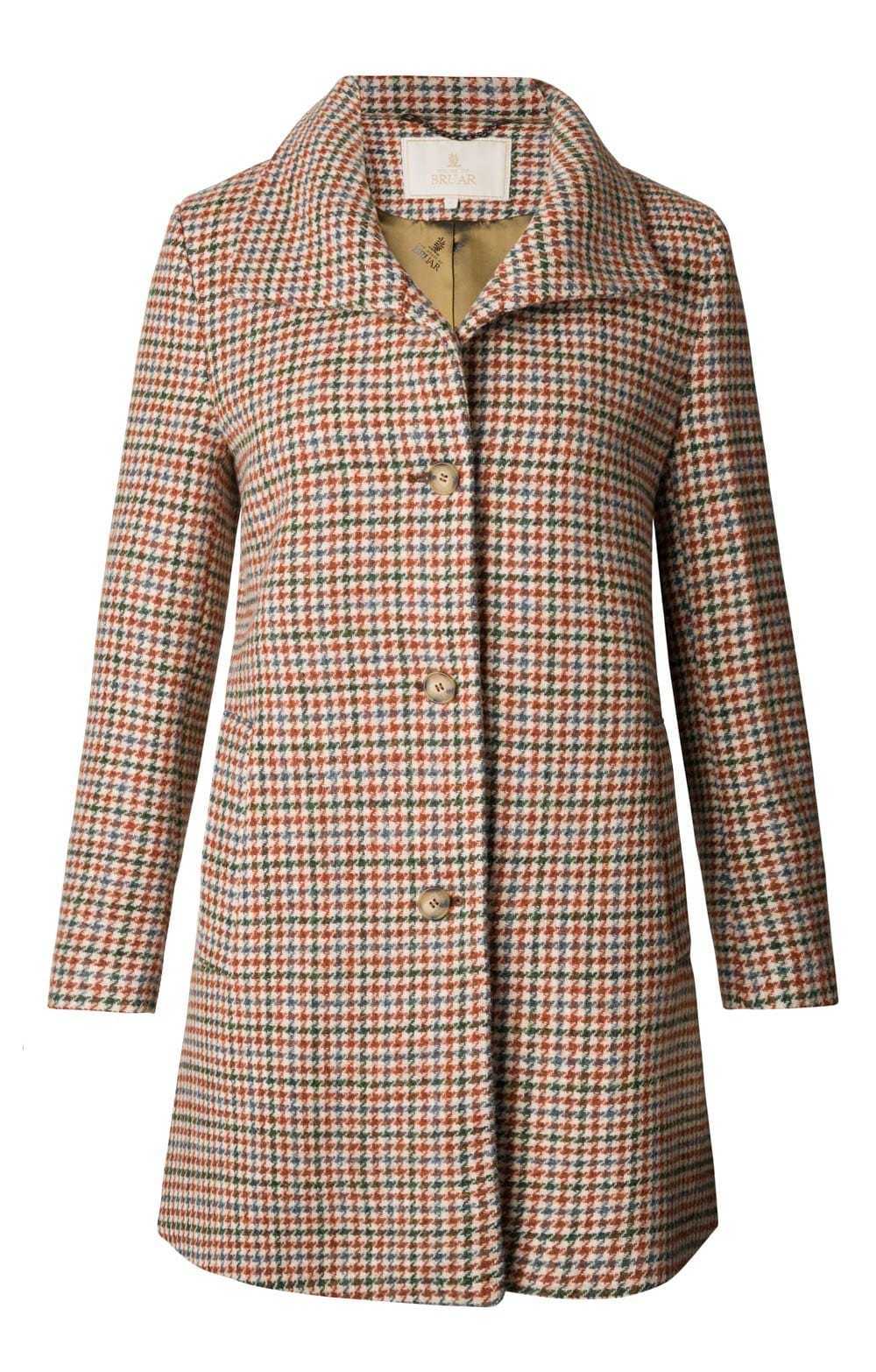 Mid-length coat in Harris Tweed®.Cosy funnel neck.Single breasted button fastening.Flattering fitted waist and slight flare.Feature House of Bruar buttons.House of Bruar satin lining.Designed by The House of Bruar.Enjoy wearing over wide leg flannel or wool-blend trousers and a jumper and shirt combination as an impressive option for lunches and smart casual events, or simply over jeans, a lambswool roll-neck and autumn boots for an easy weekend look.