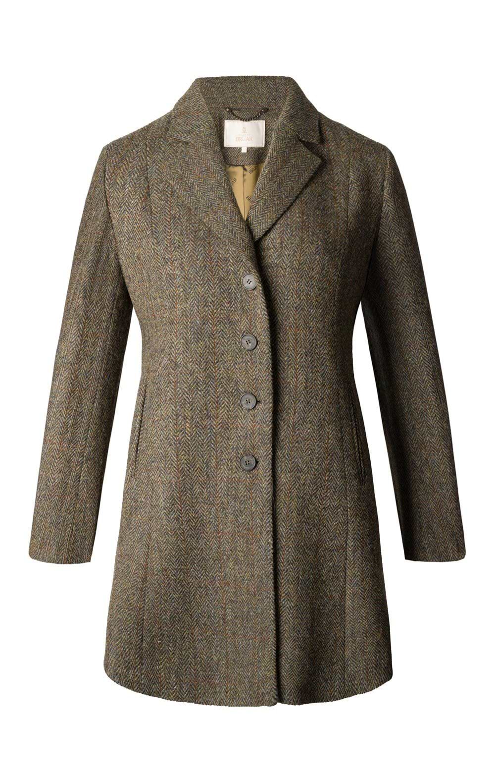 Mid-length coat in Harris Tweed®.Notched lapel.Single-breasted button fastening.Flattering fitted waist and flare toward the hem.Feature House of Bruar buttons.House of Bruar satin lining.Designed by The House of Bruar.A coat that will go with any outfit, this piece will look superb over jeans and a simple roll-neck jumper, but is smart enough to look wonderful over a tailored suit for a more formal country event.