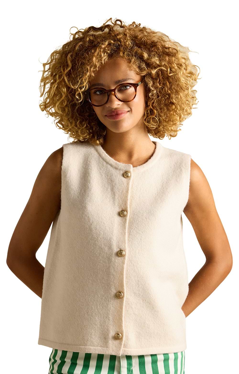 Its luxuriously smooth knit fabric offers warmth with lightness, making it a reliable go-to through changing temperatures. Cut in a flattering straight fit, it layers comfortably over shirts and tees while maintaining a clean, modern shape. Five embossed metal shank buttons add a refined accent to the front, nodding to traditional styling with a contemporary twist. Finished with a classic round neckline and neat armholes, it brings polish without feeling too formal. Whether you're heading into town for a morning coffee or layering up for a creative afternoon in the studio, this vest blends comfort with understated elegance.