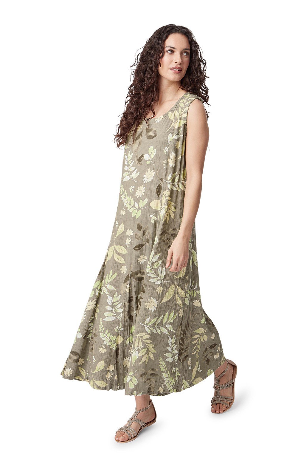 Round neckSleevelessUnlinedSoft, light and cool crinkled viscoseRelax fitPull-on dressMidaxi lengthNo ironing neededDouble crinkled - twist and dry when washedPair with sandals and a sun hat for a casual daytime ensemble, or with wedges and a statement necklace for an evening look.