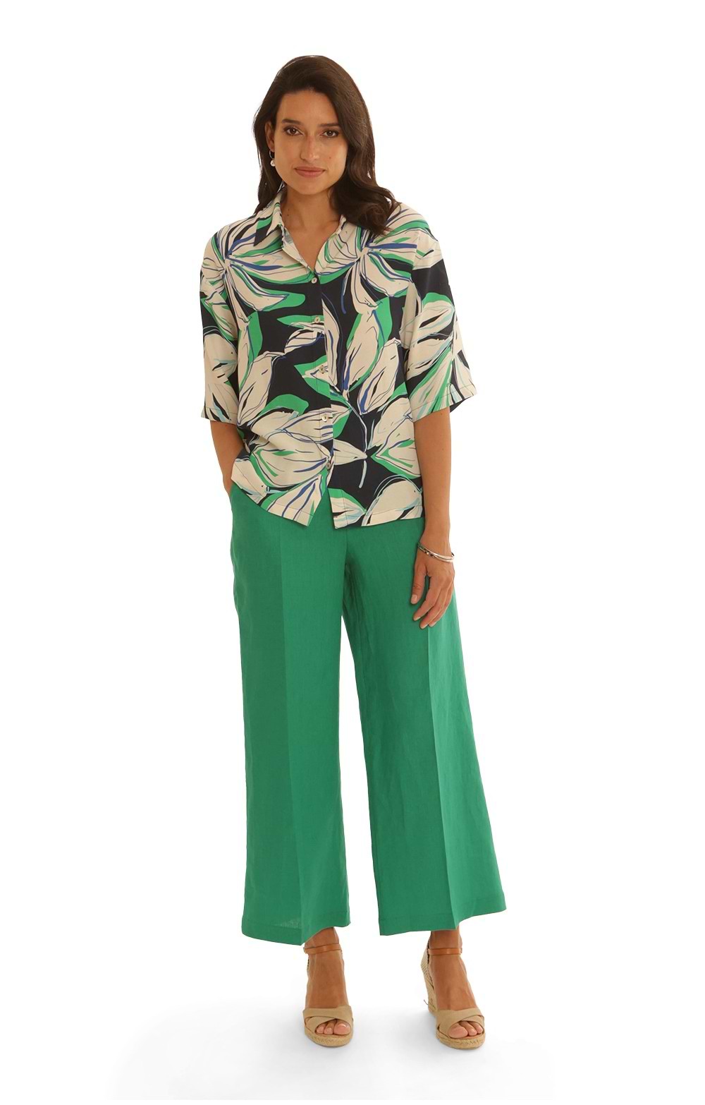 Tailored cropped trousers in crisp summer linenFlat frontBack elasticated waistbandInvisible zip at side seamFabric covered button fastening on waistPleated designThese breezy linen pants provide a slightly smarter alternative to palazzo pants but with all the breezy comfort. Team with a vest top and a coordinated oversized shirt.