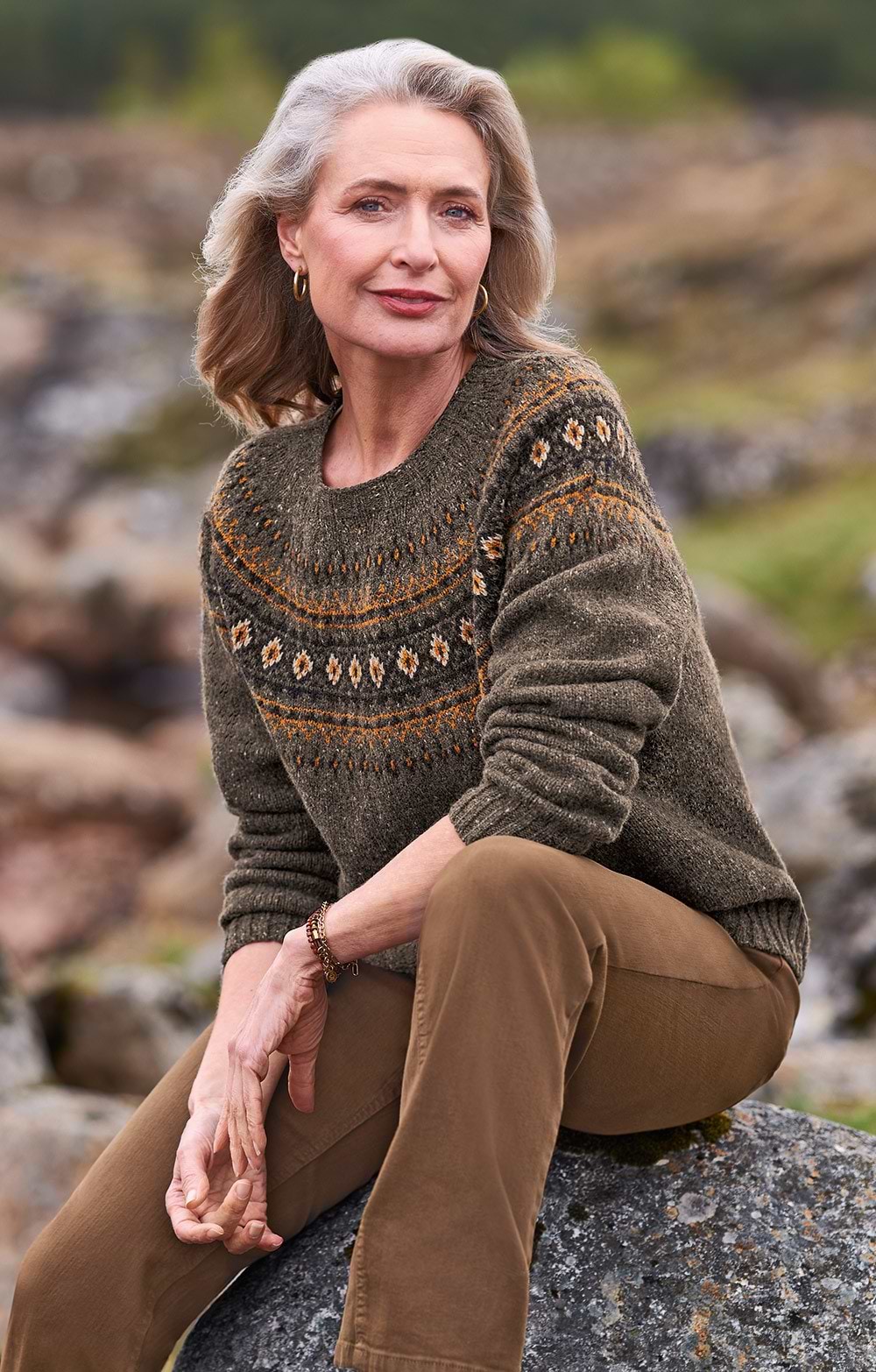 Scottish knitted jumper in soft flecked lambswoolFairisle designRelaxed fitRelaxed double-ribbed necklineEnjoy wearing this wonderful jumper with your favourite moleskin jeans, cord skirts or denims, adding leather boots and a tweed jacket for a covetable country look.