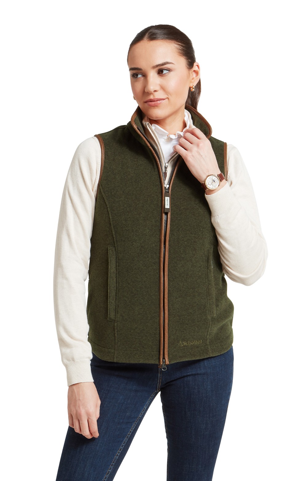 Practical country fleece bodywarmerZip fasteningSecure zip pocketsSuede-look trim around the zip, collar and arm holesStand collarAdjustable drawcord flatters the waistSchöffel branding to zip pull and lower hemTeam with jeans or jodhpurs and a country shirt for a confident country-inspired outfit that will also look great in town.