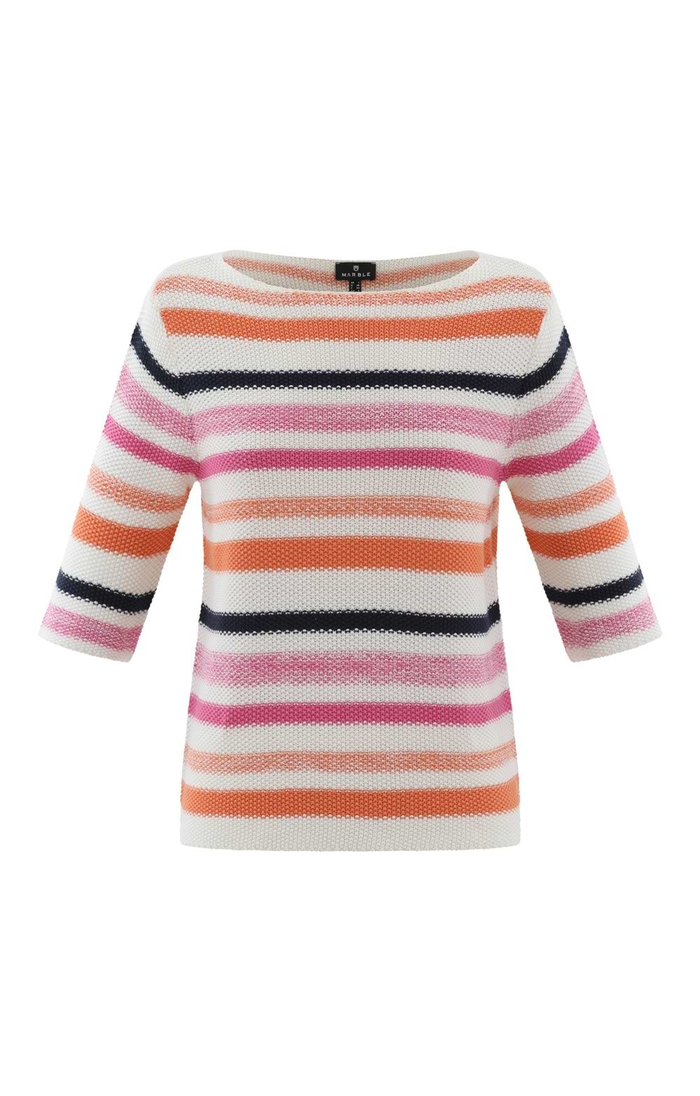 Lead by a design of different coloured stripes in contrasting weights and widths, the cotton blend Marble multi stripe sweater is simply cut in a relaxed shape with a boat neckline and elbow length sleeves. Its gently textured knit is light and summery, making it an easygoing accompaniment to swinging skirts and cool shorts.