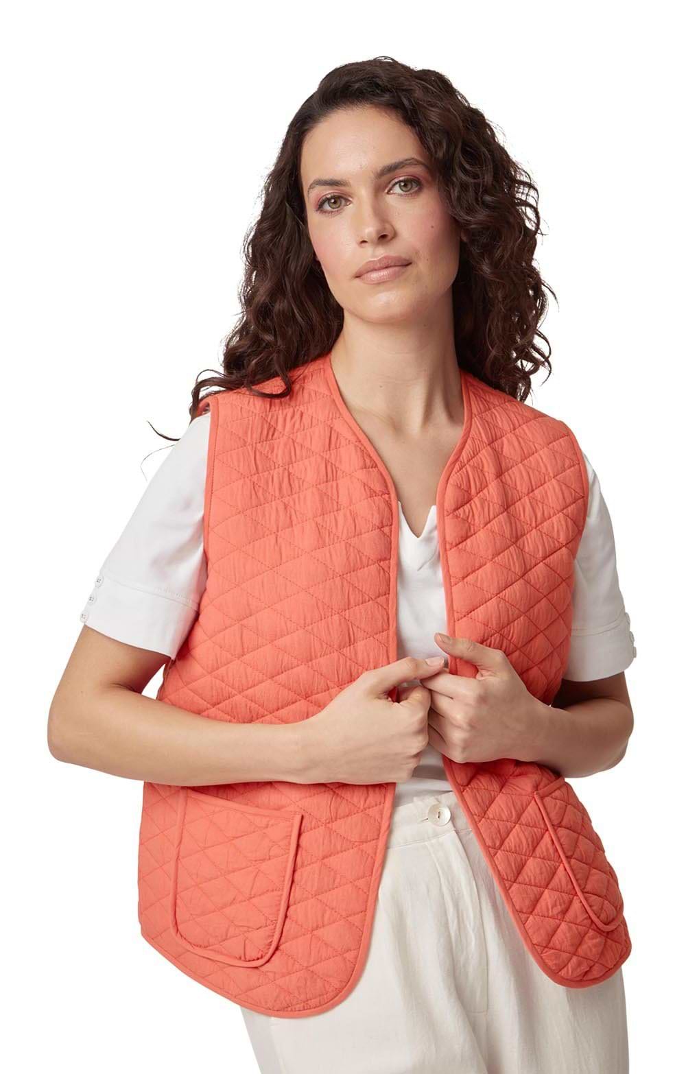 CollarlessReversible design with solid internal colourUnlinedRelaxed fitSleevelessEdge-to-edge design with no fasteningFront patch pockets on printed sideSumptuous and warm quilted cottonLayer over a long-sleeve tee and jeans for a casual outing, or style over a blouse and skirt for a more polished appearance.