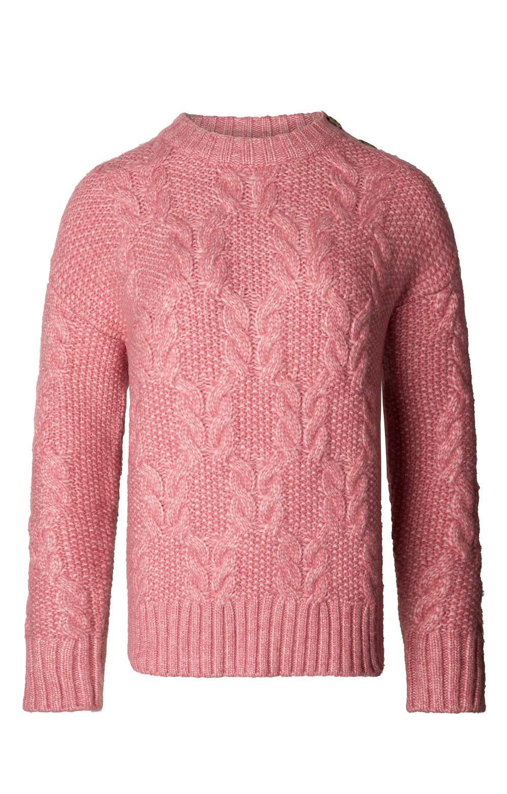 Crew neck Aran knit-style jumper.Shoulder button detail.Boxy shape.Enjoy wearing this fabulous jumper with your favourite belted chinos, bengalines or country cords.