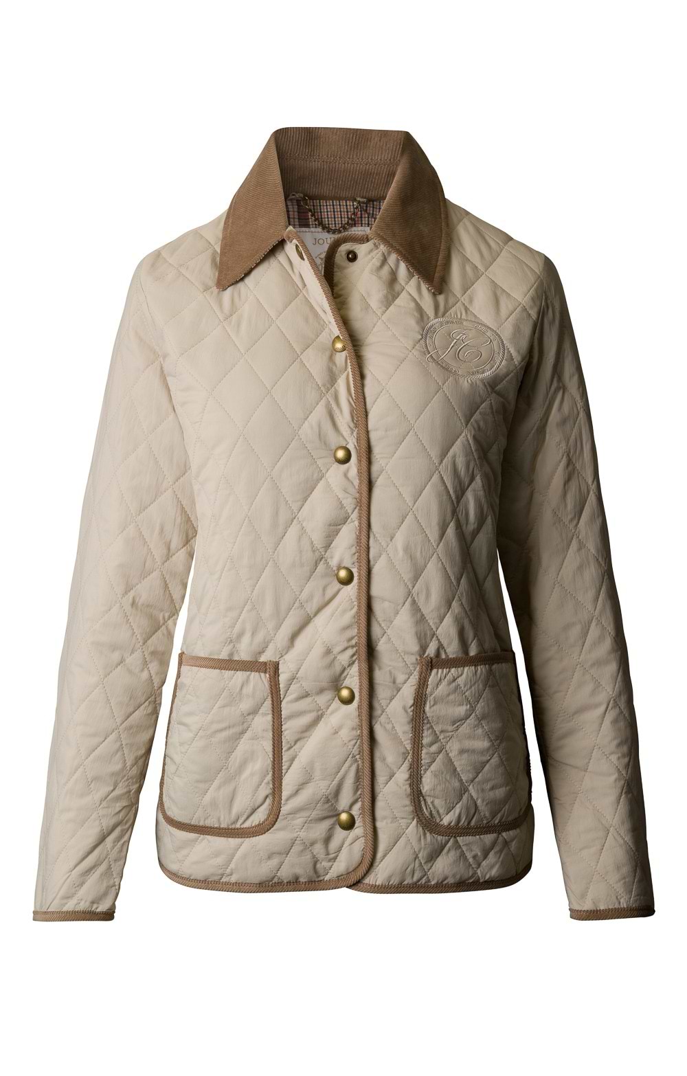 Diamond quilt jacket with showerproof fabricFlat wadding for a touch of warmthCorduroy collarCorduroy pipingExclusive check pattern liningZip and press-stud fasteningSlightly dropped shoulders for a relaxed feelTwo front patch pocketsJoules branded embroidery to the chestThis jacket will look great with most outfits, smart enough to wear with wide leg trousers and a crisp shirt for work, but casual enough to look great with jeans or jodhpurs and wellies for a splashy country dog walk.