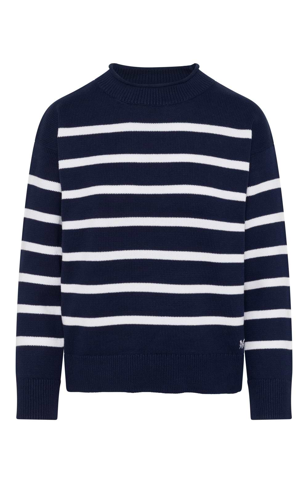 Striped cotton jumperEmbroidered crossed oarsRolled necklinePair with jeans or chinos for a relaxed, coastal-inspired look that transitions seamlessly through the seasons.