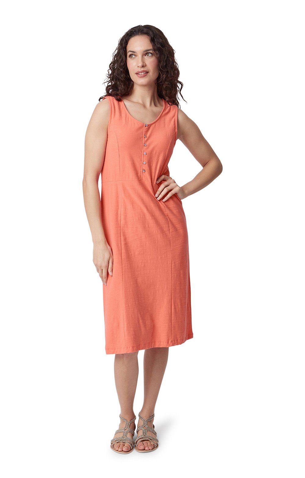 Crafted from soft, cotton slub jersey with natural stretch, it provides a flattering semi-fitted silhouette that gently hugs the body. The sleeveless design and below-the-knee length enhance its breezy appeal, while decorative button detailing along the yoke adds a charming touch. Princess seams contribute to its relaxed yet polished look, making it versatile for both casual outings and dressed-up occasions. Whether you're enjoying a leisurely afternoon in the park or attending a summer gathering, this dress adapts beautifully to your plans.