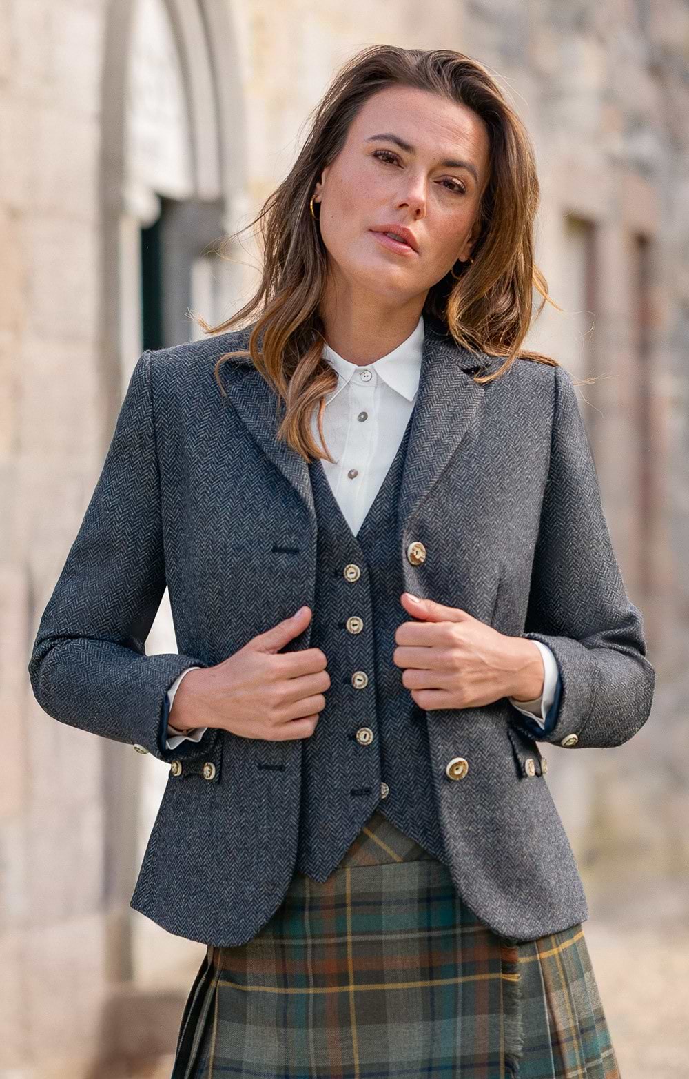 Our ladies tweed Highland jacket captures the very heart of Scottish heritage, offering a garment that speaks to tradition and enduring quality.