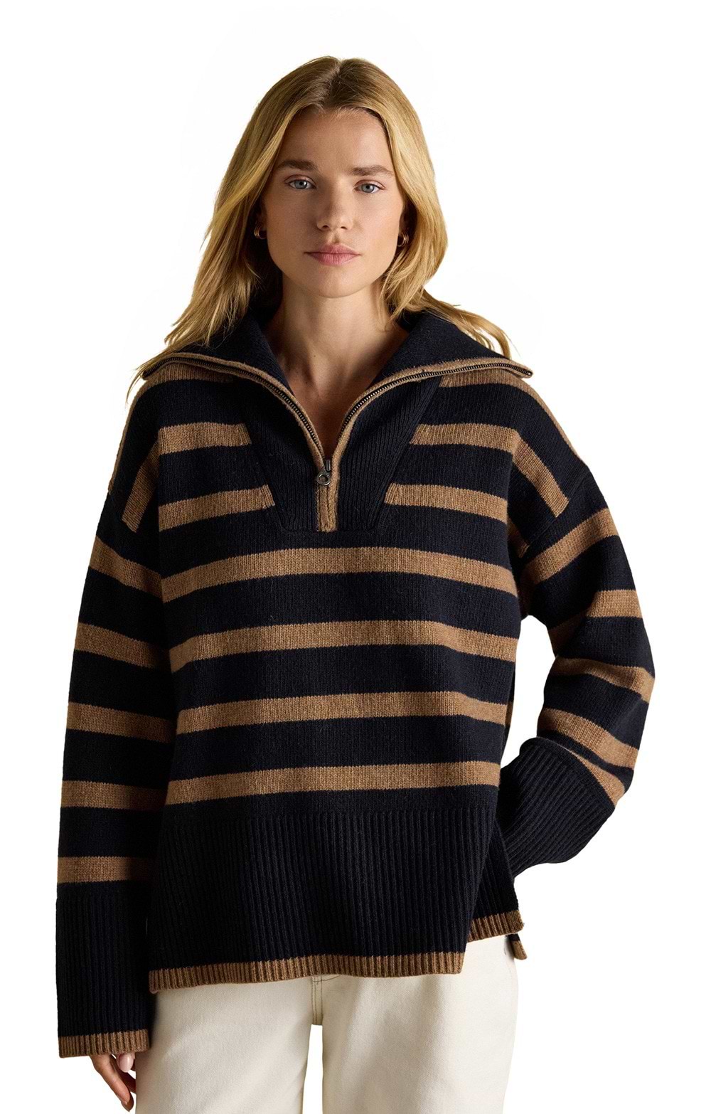 This Ladies Joules Waverley Stripe Quarter Zip Funnel Neck Jumper perfectly combines a contemporary oversized-fit with a flattering stripe design.