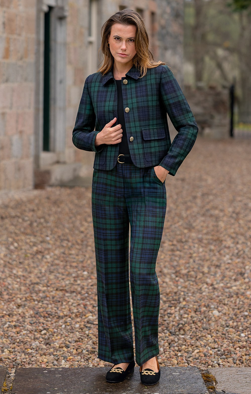 The high waist not only defines the waistline but also creates the illusion of longer, leaner legs, contributing to an elegant and polished appearance. The bold tartan pattern, rich in Scottish heritage, brings a distinctive touch to your wardrobe, smoothly transitioning through the seasons. These trousers pair seamlessly with neutral or solid-coloured tops, allowing the vibrant tartan to take centre stage without overwhelming the ensemble. Whether you're preparing for a leisurely outing or a more formal affair, these trousers adapt with ease, allowing for a multitude of styling possibilities.