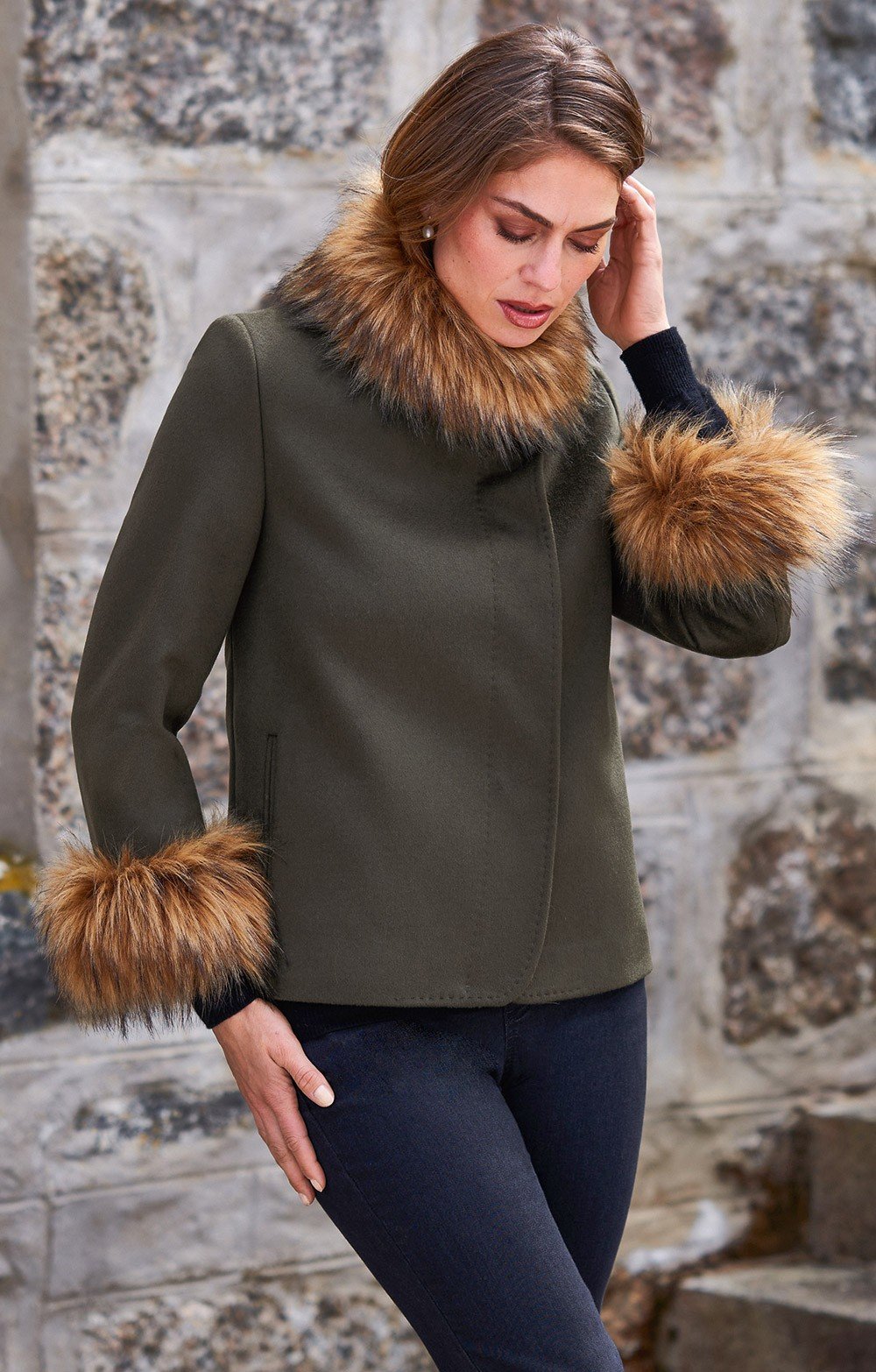 Ladies Wool Cashmere Faux Fur Trim Coat