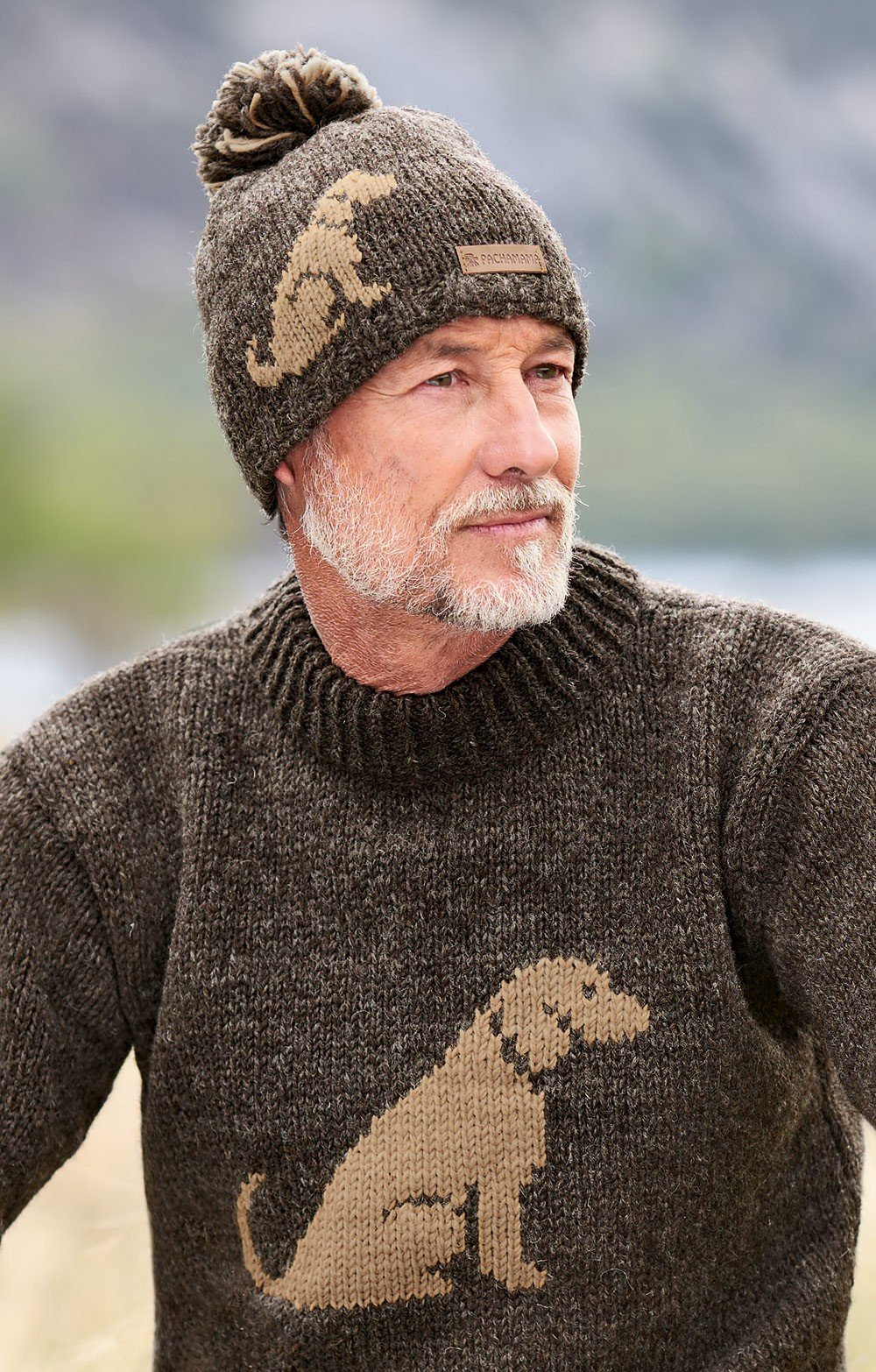 Topped with an irresistible woollen pompom, with ribbing around the crown, this cosy beanie in a chunky pure wool is guaranteed to keep you deliciously warm and comfortable, with fleece fabric around the forehead providing even more comfort and insulation. Charm matches practicality with an adorable Labrador, its tail wagging in anticipation, knitted into the design.