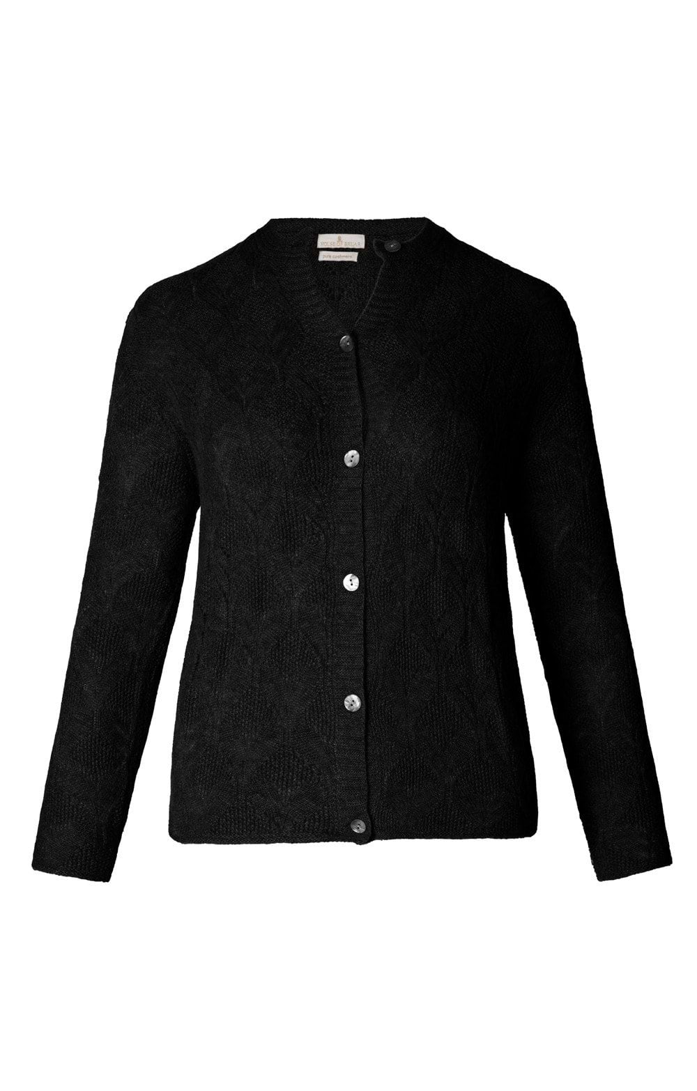 A finely knitted crew neck cardigan is an essential piece in many ladies wardrobes, teamed with anything from tea dresses to smart jeans. This Bruar-designed example is particularly pretty, using an all-over fancy knit design resembling leaf forms, teamed with a ribbed placket with faux shell buttons that catch the light. A fine rolled hem and cuffs almost give the feel of tailoring as opposed to knitwear, giving this piece a smart edge that would make it suitable for more formal events.