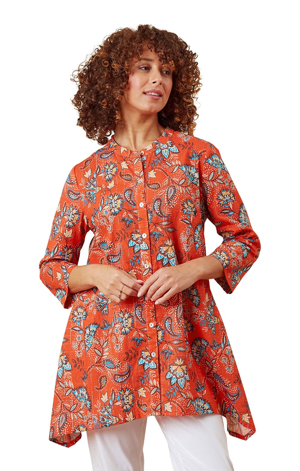 Adorned with a paisley floral print this top features a band collar and full button front lend a tailored touch, while three-quarter sleeves and a softly flared shape offer relaxed elegance. The tunic-length hem dips gently at the sides to create a flattering line through the body. From browsing coastal galleries to enjoying midweek lunch dates, this piece brings colour and charm with every wear.