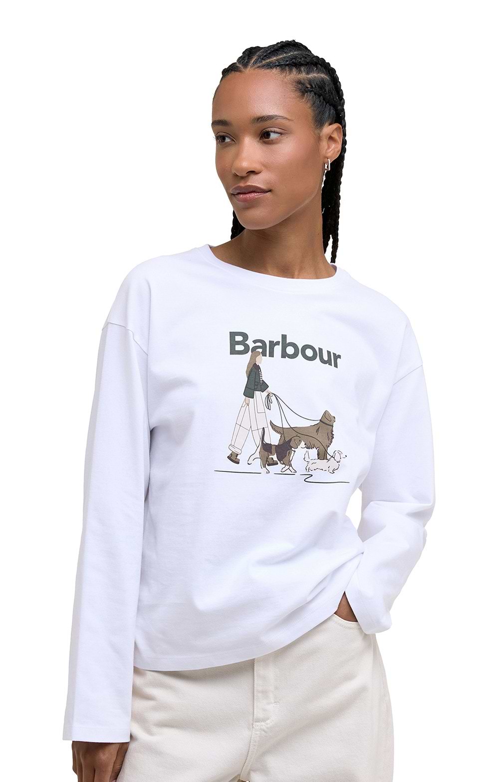 The ladies Barbour Woodhouse long sleeve t-shirt offers relaxed comfort with its oversized fit and charming dog walking graphic on pure cotton.