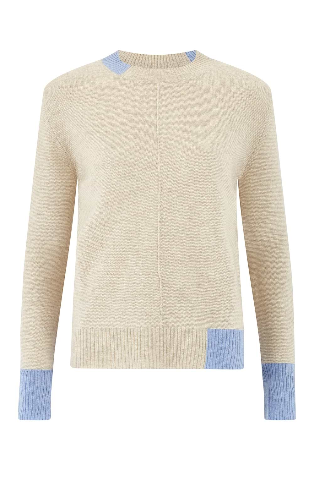 Colour pop crew neck jumperExposed seamSlight drop shoulderColour blocking on cuffs, hem and collarPair with jeans with boots for a chic casual look and add a wool coat for the colder months.