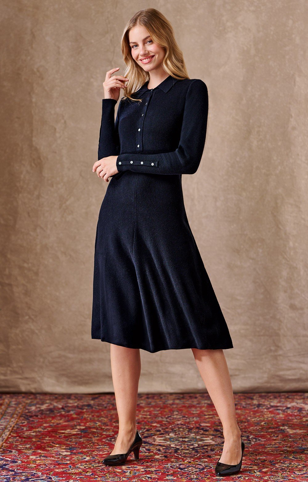 Our exclusive blend of fine merino and super-soft cashmere finds its ultimate expression in this wonderfully elegant four-button cuff shirt neck dress design.
