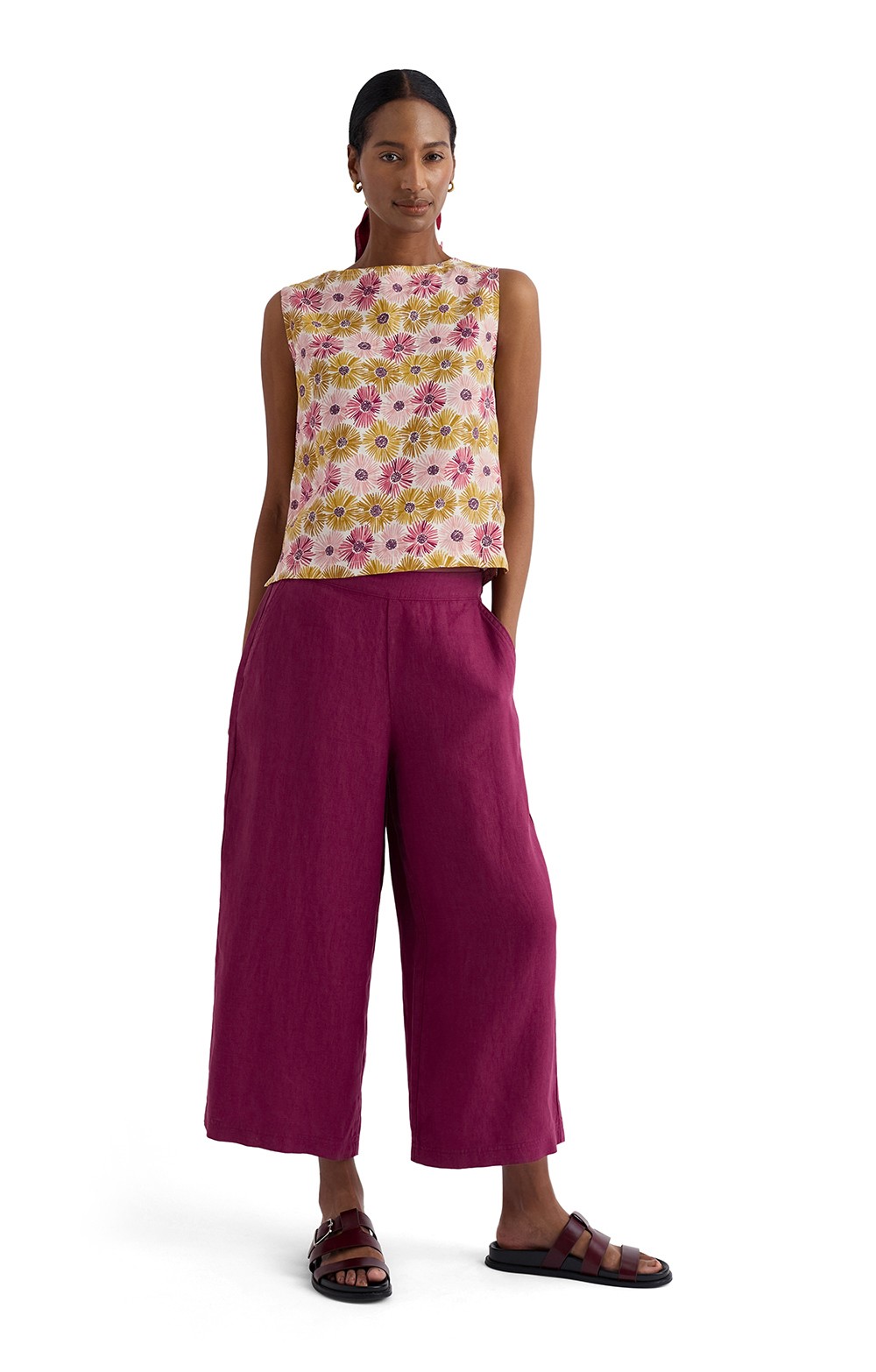 100% garment-dyed linen trousersWide cropped legHidden side zip with elasticated backSlanted side pocketsNatural waistStyle with a tucked-in linen blouse and flat sandals for city exploring, or add a knitted top and wedges for evening dining.