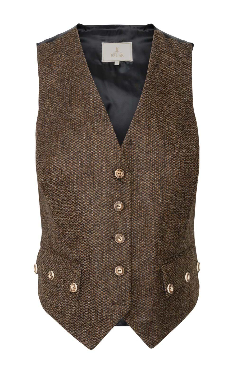 Traditional ladies waistcoat in British TweedAuthentic Highland details include mock horn buttons and triple button flap pocketsBack panel in coordinating colour with adjustable tabDesigned by The House of BruarIdeal for formal country or Highland-themed events, this superb waistcoat will also look great in more casual scenarios - team with a crisp oversized white shirt and wide leg trousers or even jeans to add style and individuality to your everyday wear.
