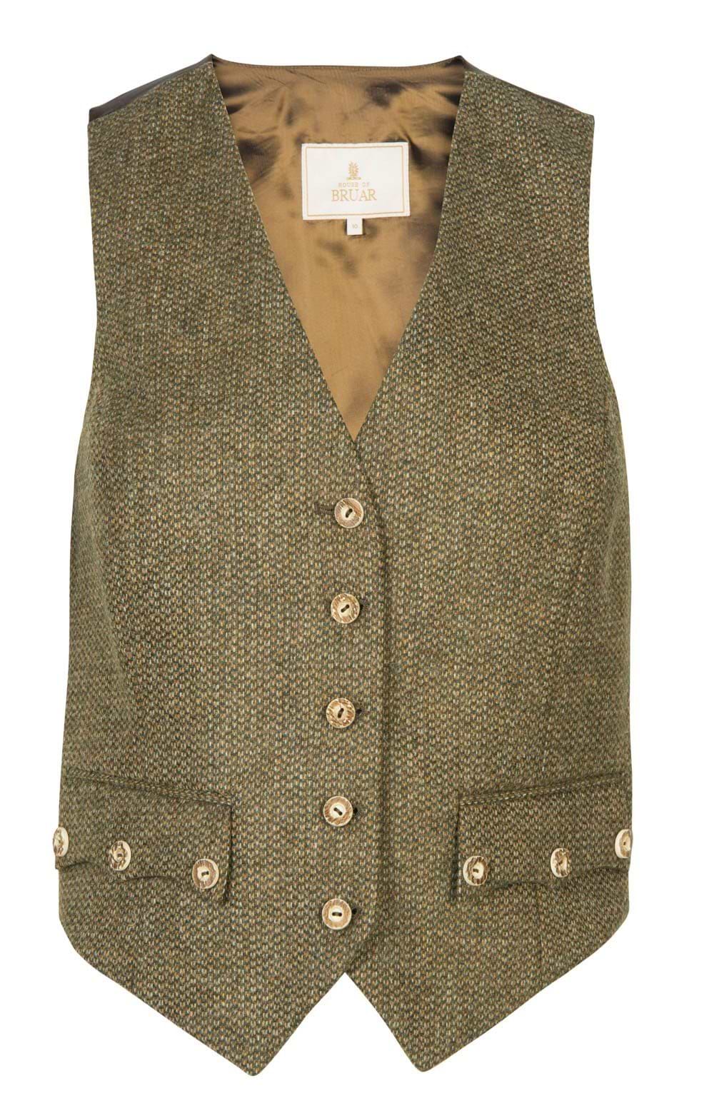 Traditional ladies waistcoat in British TweedAuthentic Highland details include mock horn buttons and triple button flap pocketsBack panel in coordinating colour with adjustable tabDesigned by The House of BruarIdeal for formal country or Highland-themed events, this superb waistcoat will also look great in more casual scenarios - team with a crisp oversized white shirt and wide leg trousers or even jeans to add style and individuality to your everyday wear.