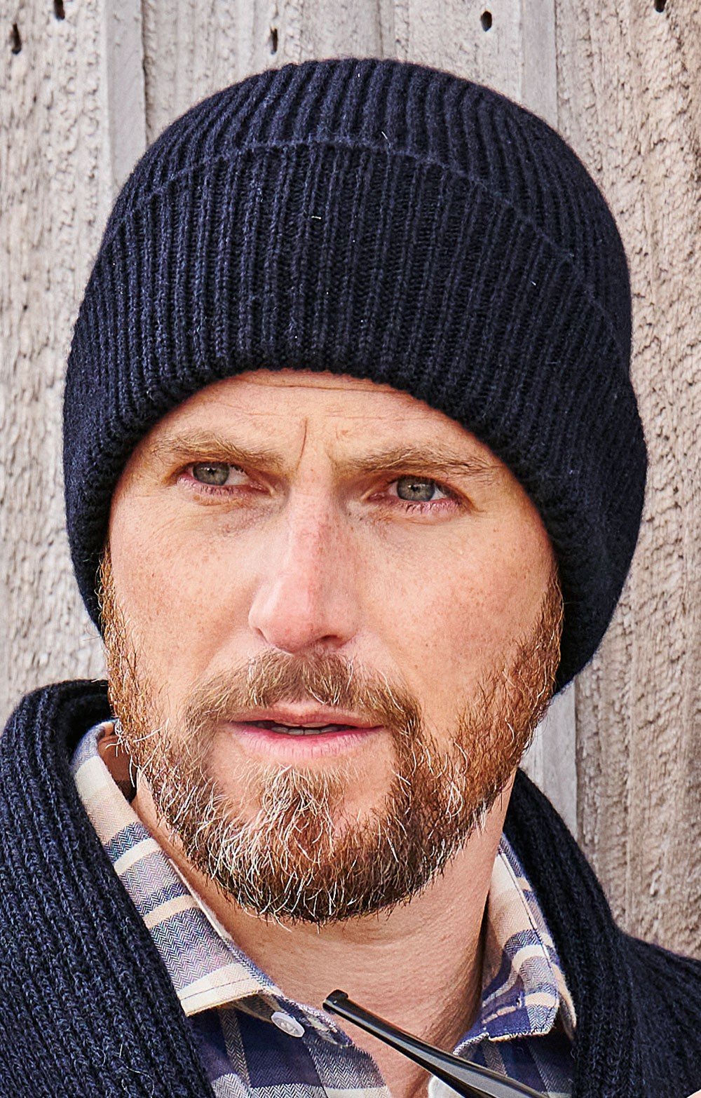 Knitted traditionally in a single piece, this cosy hat features a turn-back brim and a rugged ribbed knit which looks especially superb in the soft but still rustic lambswool yarn.