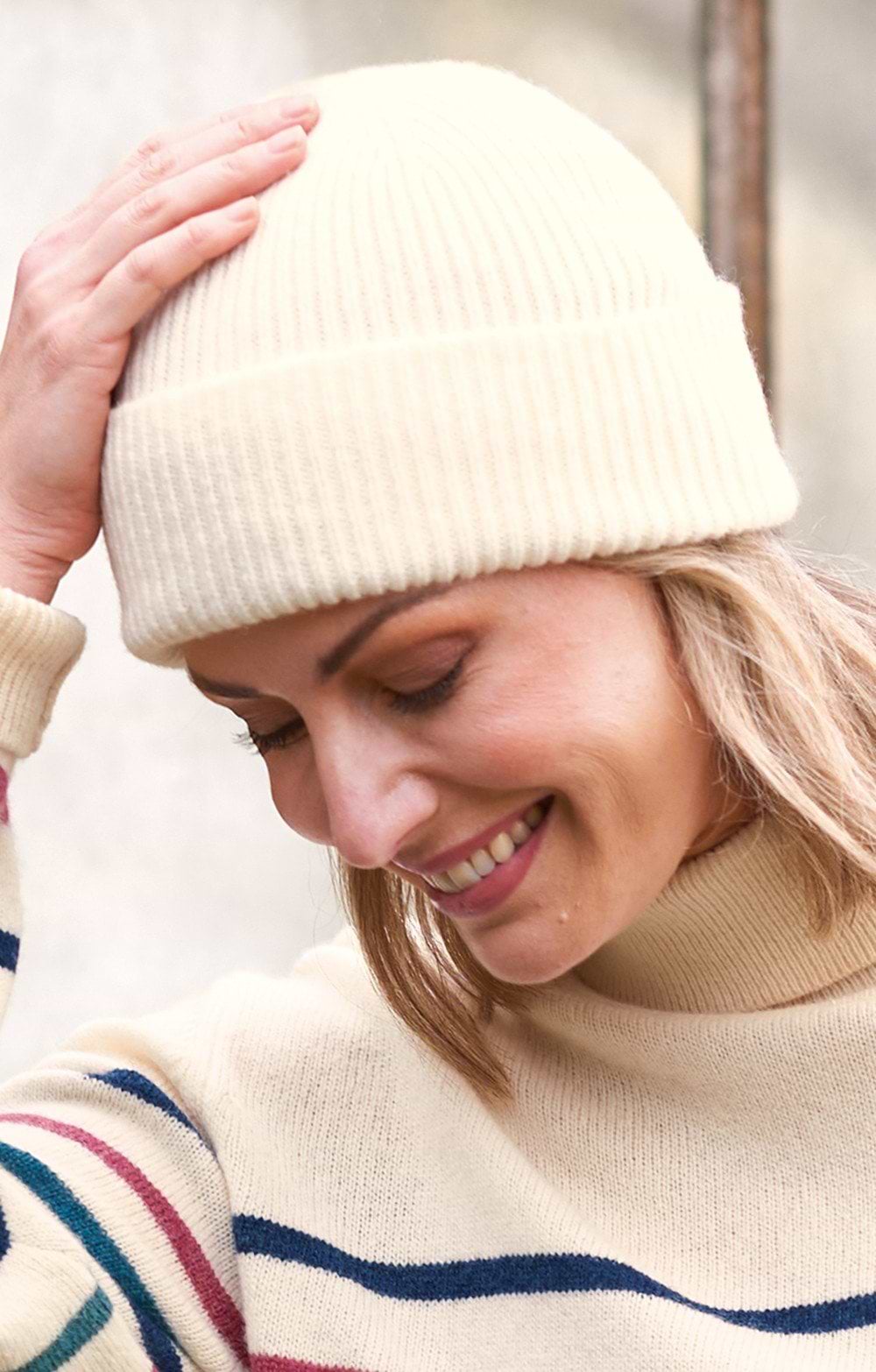 Ribbed beanie in soft lambswoolTurn back brimRibbed knitMade in ScotlandPlenty of stretch in the design means that one size fits all, and this beanie is suitable for men or women, making it the ideal garment to offer as a treasured gift.