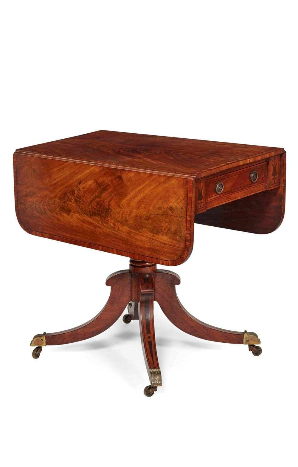 Late George III Mahogany, Satinwood, and Inlay Pedestal Drop-Leaf Table, Early 19th Century