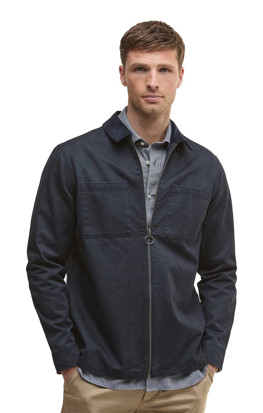 The men's Barbour Lenker twill overshirt combines cotton twill construction with versatile styling, offering comfortable layering options for various occasions.