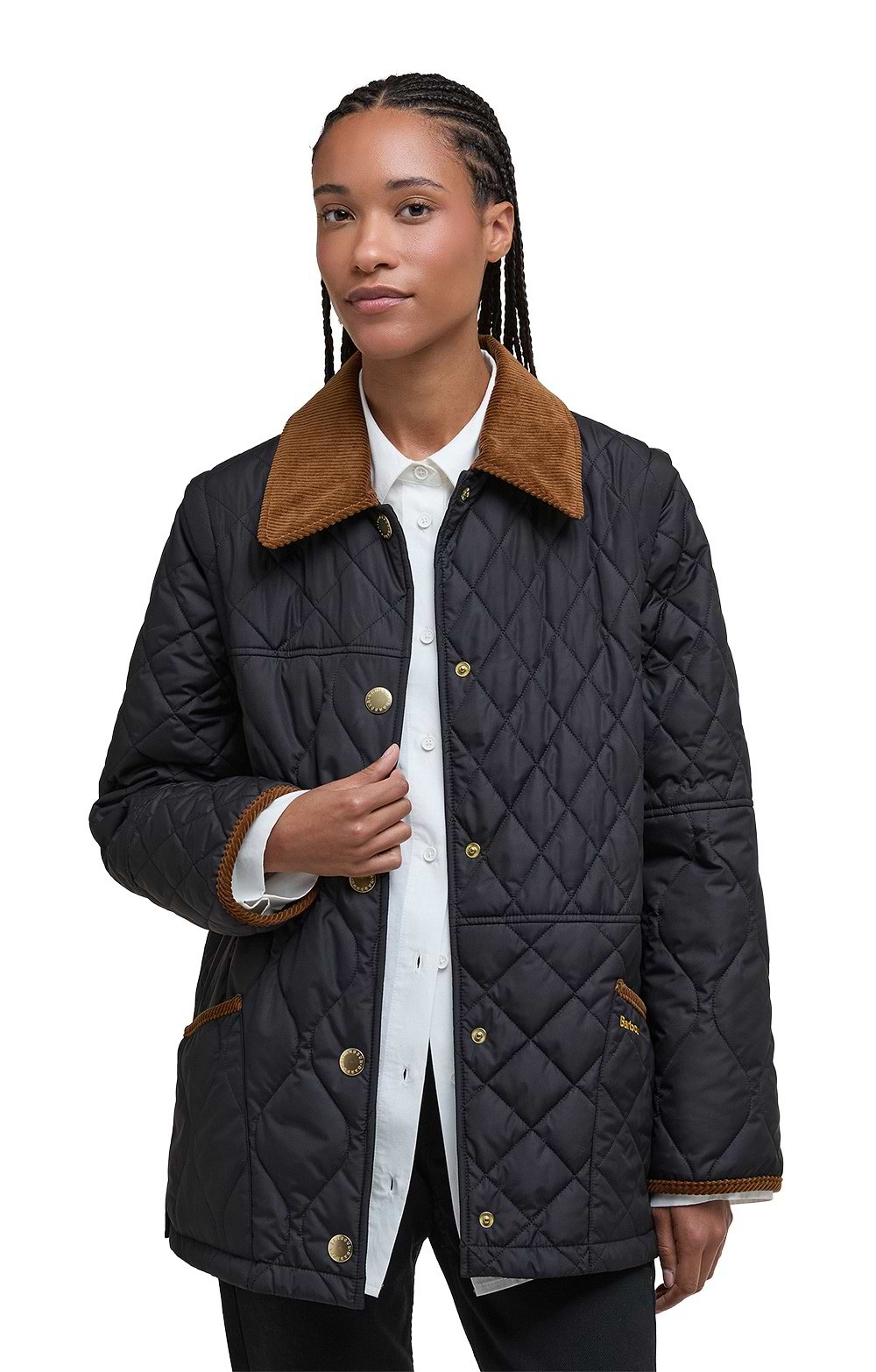 With a short boxy silhouette and heritage-inspired trims, the ladies Barbour Lorrie quilted jacket blends classic country roots with urban styling.