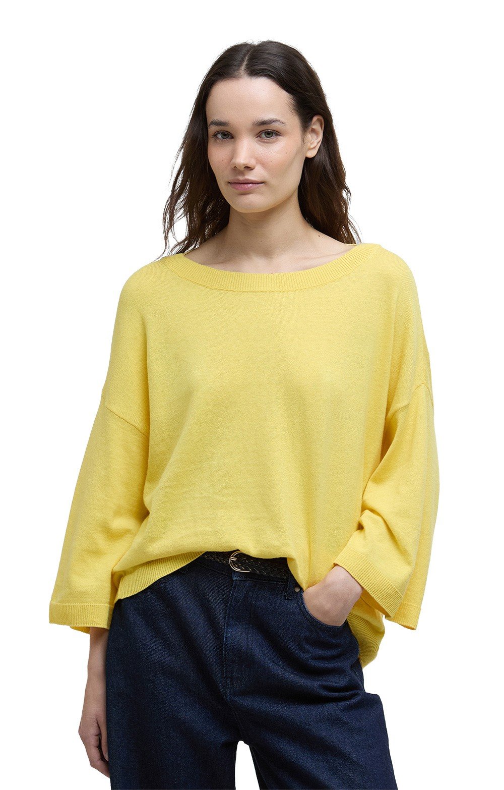 A relaxed and stylish alternative to the classic fine jumper, this stylish jumper features flowing lines, a relaxed crew/boat neck, floaty bell sleeves and an oversized fit. Add in a clever fabric knitted from cotton with a touch of linen, you'll breeze through summer with ease!