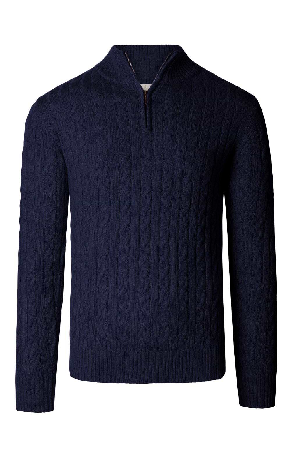 T-zip jumper in pure cashmereCable-knit styleSemi-fittedRibbing to neck, cuffs and hemDesigned by The House of BruarThis luxurious T-zip will look great over a tattersall shirt and your favourite moleskin jeans, with the option of adding a nautical blazer or country tweed jacket for sophisticated smart-casual events. Alternatively, just team it with your favourite jeans to add some cashmere luxury to your off-duty weekend look.