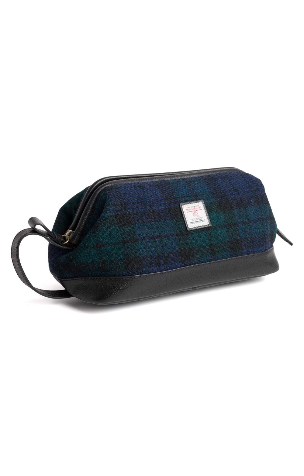 Spacious doctor's bag-style washbag.Base and trims in high quality leather, bag in Harris Tweed®.Lined interior.Inner pocket and inner zip compartment.As well as an impressive washbag for you to travel with, this will make a wonderful gift for a friend who loves to travel, or travels as part of their job, ensuring that they take a hand-crafted piece of Scottish heritage with them wherever they go.