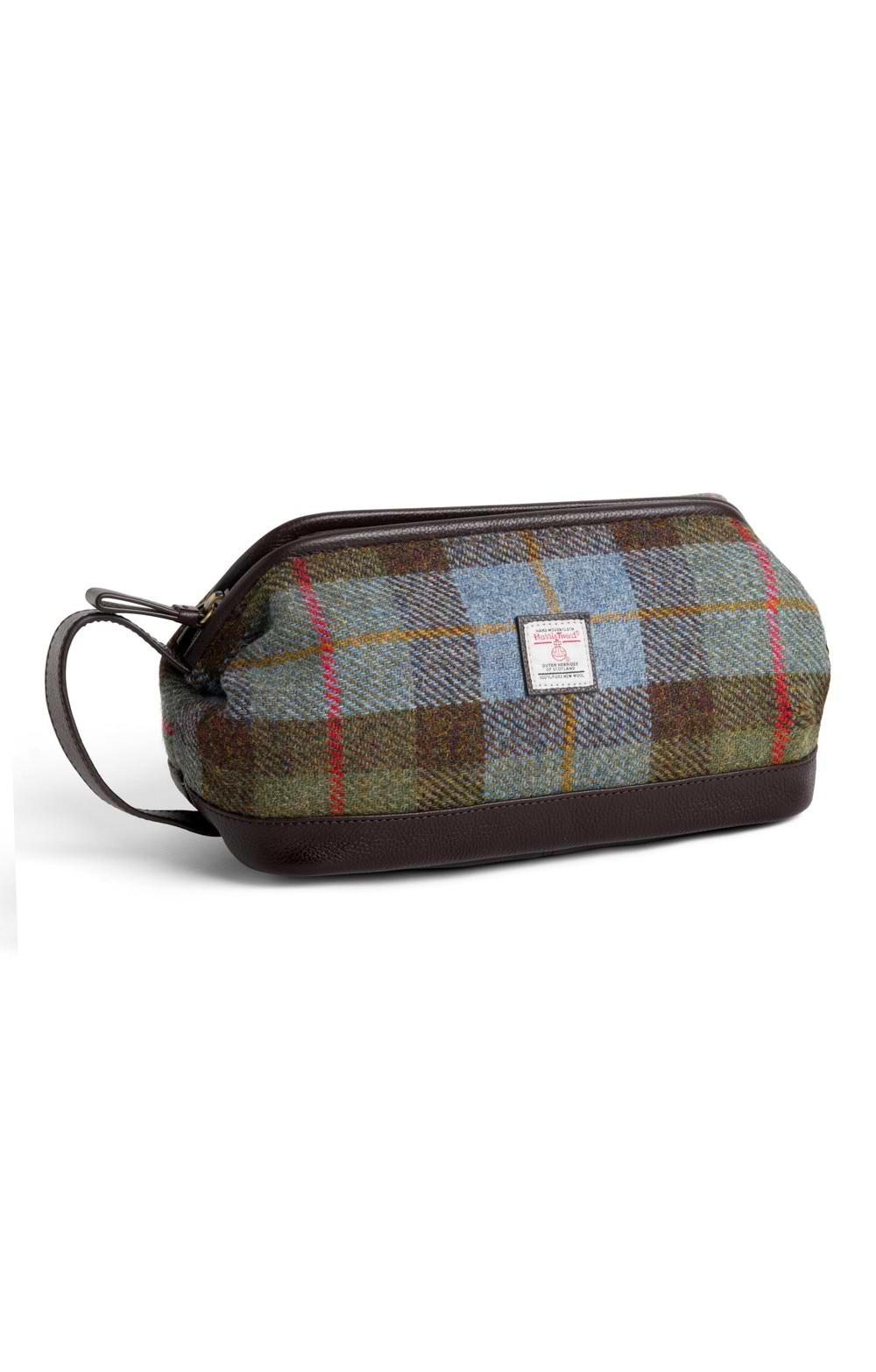 Spacious doctor's bag-style washbag.Base and trims in high quality leather, bag in Harris Tweed®.Lined interior.Inner pocket and inner zip compartment.As well as an impressive washbag for you to travel with, this will make a wonderful gift for a friend who loves to travel, or travels as part of their job, ensuring that they take a hand-crafted piece of Scottish heritage with them wherever they go.