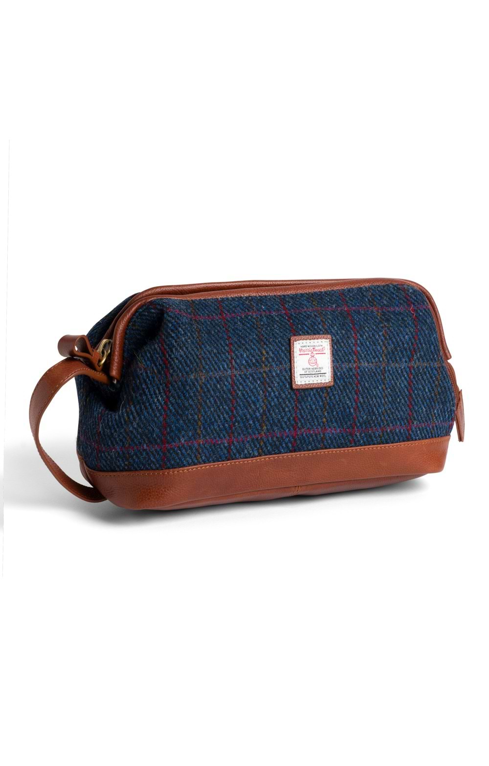 Spacious doctor's bag-style washbag.Base and trims in high quality leather, bag in Harris Tweed®.Lined interior.Inner pocket and inner zip compartment.As well as an impressive washbag for you to travel with, this will make a wonderful gift for a friend who loves to travel, or travels as part of their job, ensuring that they take a hand-crafted piece of Scottish heritage with them wherever they go.