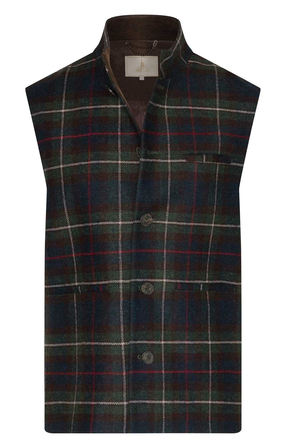 Country waistcoat in worsted tartan fabricWelt pockets to the sides and chestStand collarDesigned by The House of BruarThis piece will look great with fine knitwear on the golf course and in the clubhouse, giving a Scottish feel to your sporting achievements, but will look equally special over a button-down shirt and blue jeans for a date-night dinner.