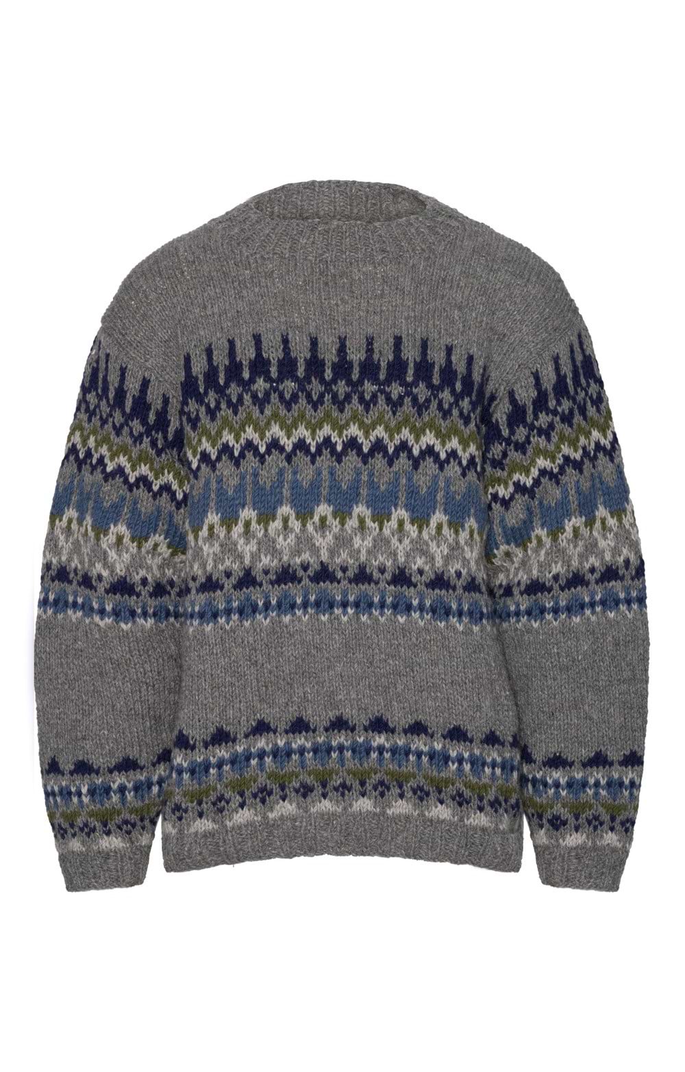 The men's Pachamama Westport sweater is a timeless piece, featuring a traditional Fairisle pattern with a striking palette.