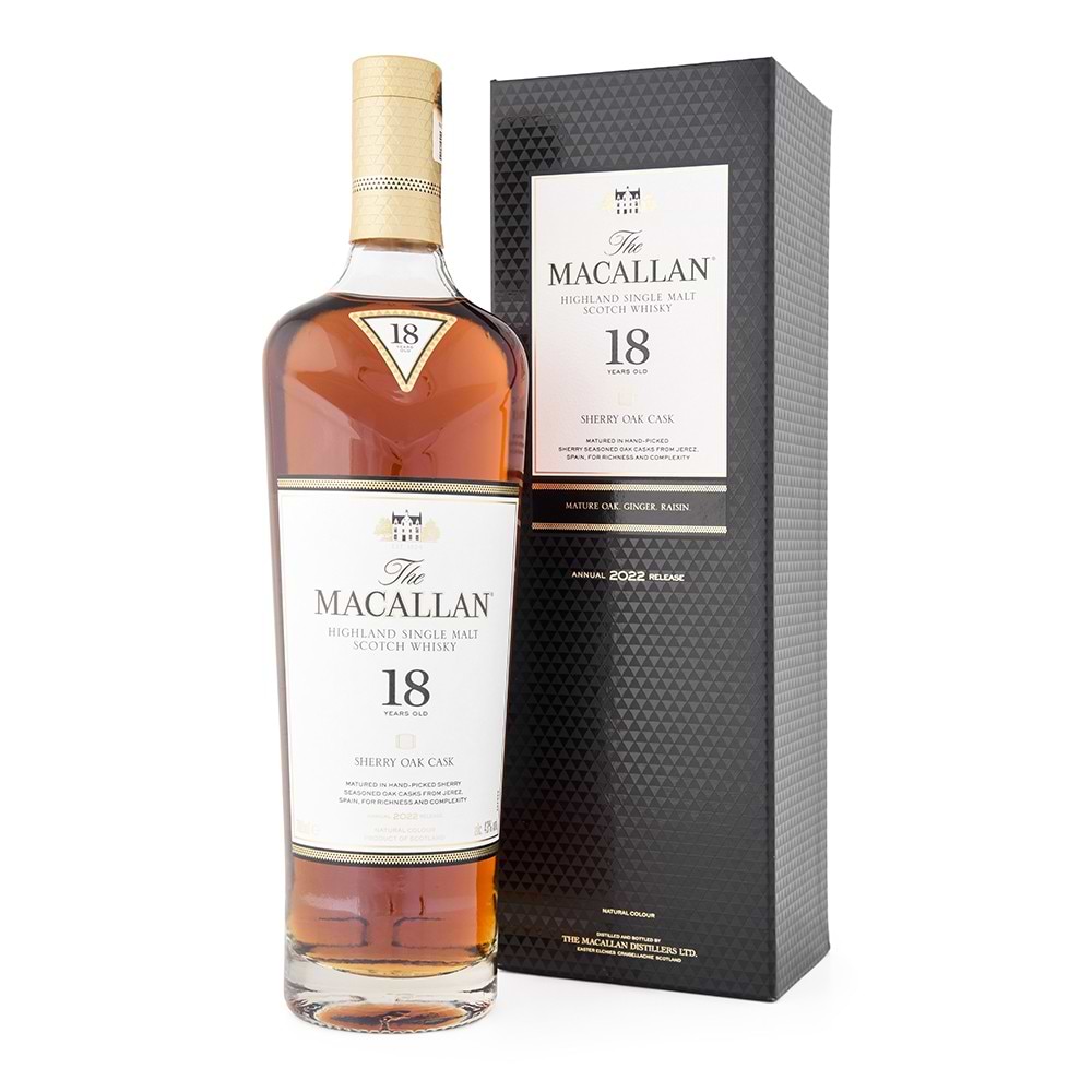 The Macallan Sherry Oak 18 Years Old forms part of Macallan Sherry Oak range which features a series of single malt whiskies matured in hand-picked sherry seasoned oak casks from Jerez for richness and complexity. A full bodied palate of mature oak, ginger and raisin flavours is complemented by a light mahogany natural colour.