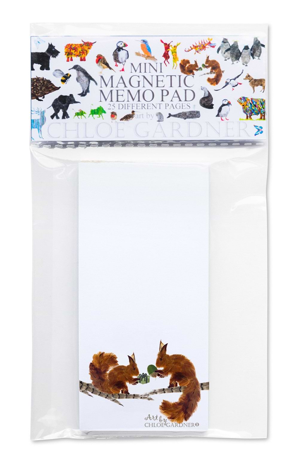 Designed in a compact format, this small memo pad features Chloe Gardner's lively artwork, from puffins and squirrels to playful boxing hares. Each sheet tears cleanly for quick reminders, shopping lists or messages, while the magnetic backing allows it to sit neatly on a fridge or metal surface. With 25 pages, it is practical, cheerful and ideal for keeping essential notes close at hand.
