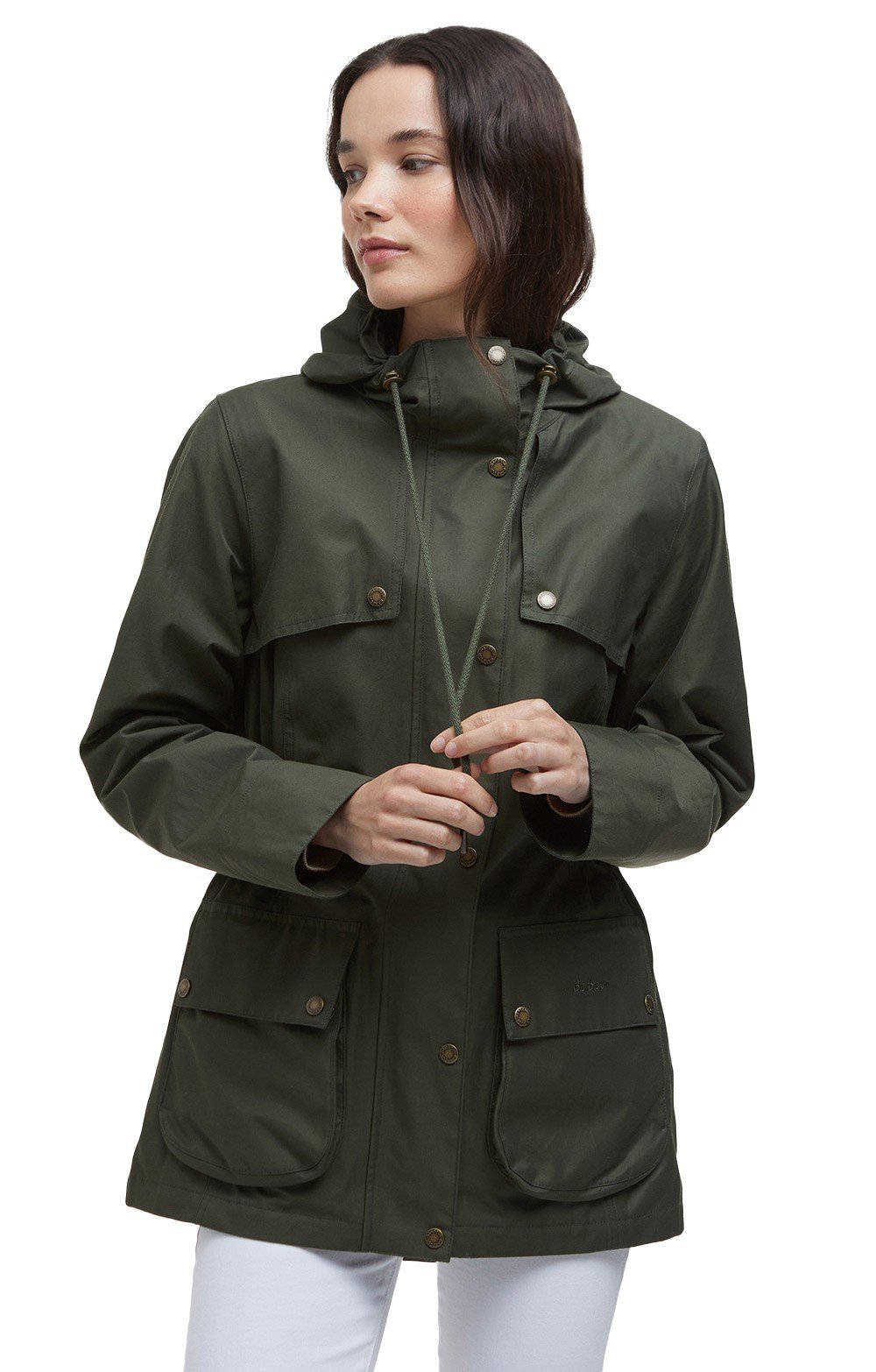 Waterproof outer shellSide elastic waist detailingFront yoke detailingCurved hemFront bellow pocketsSignature Barbour tartan liningMid-length designStyle with slim-fit jeans and ankle boots for a casual day look or layer over a knitted dress with heeled boots for a more polished ensemble.