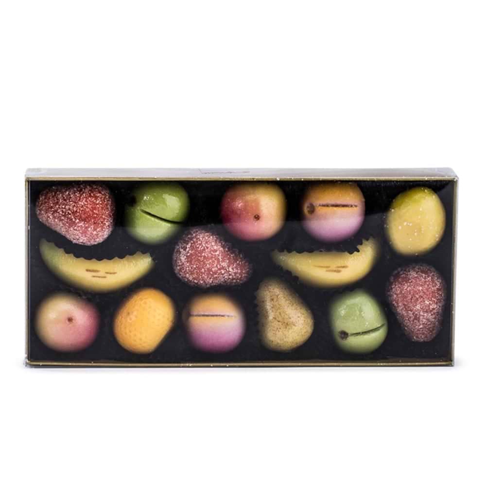 Ingredients: Marzipan (Sugar, Almonds, Added Water), Sugar, Invert Sugar, Glucose Syrup, Colours: Beetroot Red, Paprika Extract; Concentrates: Carrot, Spirulina, Safflower, Apple, Hibiscus, Lemon, Radish, Sweet Potato; Invertase, Glazing Agent: Shellac, Cornflour, Molasses.