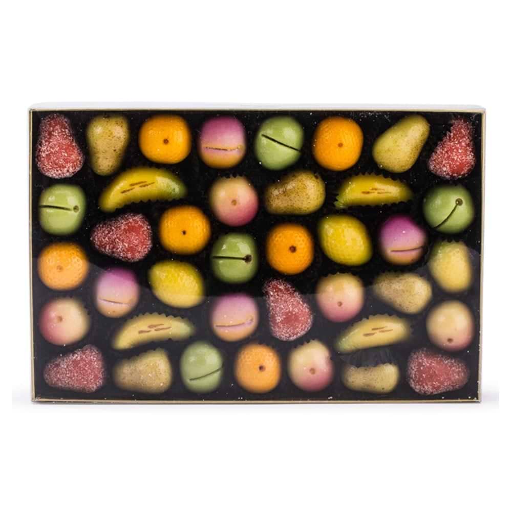 Ingredients: Marzipan (Sugar, Almonds, Added Water), Sugar, Invert Sugar, Glucose Syrup, Colours: Beetroot Red, Paprika Extract; Concentrates: Carrot, Spirulina, Safflower, Apple, Hibiscus, Lemon, Radish, Sweet Potato; Invertase, Glazing Agent: Shellac, Cornflour, Molasses.
