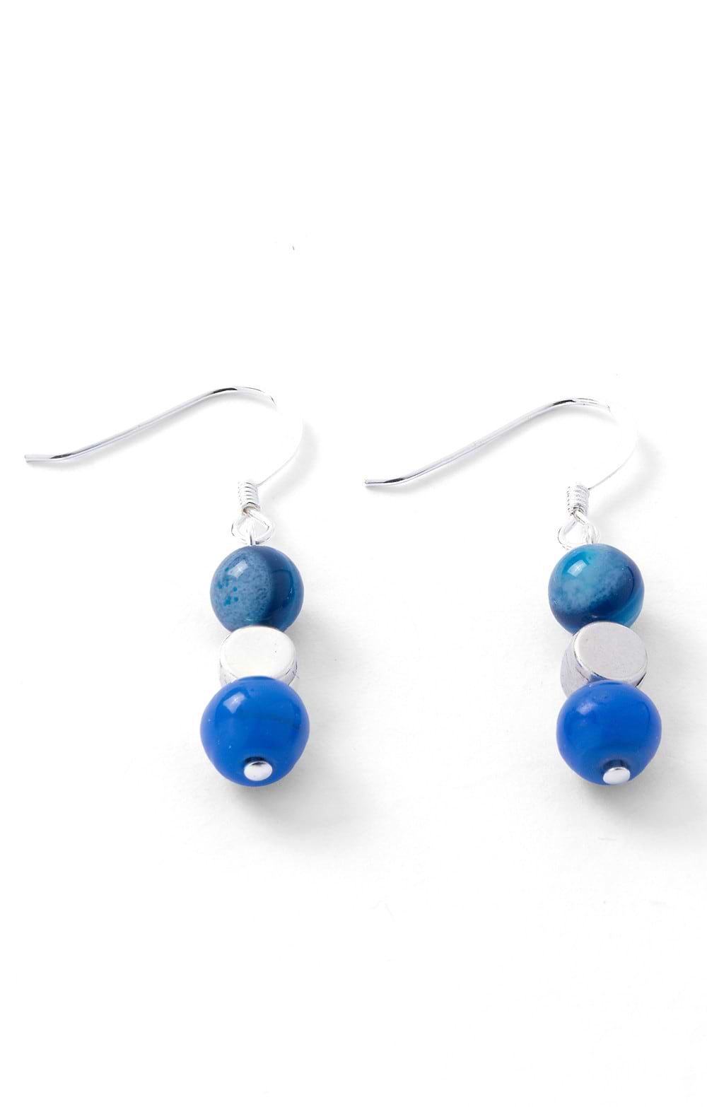 Hand-crafted in rural Wales, these delightful drop earrings each feature a round glass bead, a silver plated drum bead and an agate bead. The use of earth mined agate ensures natural markings on the stones that will be totally unique to your pair. Hypoallergenic sterling silver shepherd's hooks ensure easy wear and lasting lustre.