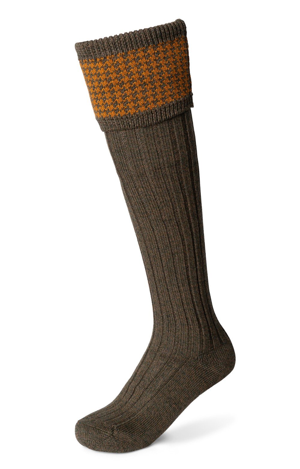 Crafted in Scotland in a breathable, hypoallergenic merino wool blend, these superb sporting socks are perfect for maintaining comfort in the field. Style is also taken care of, courtesy of their smart houndstooth check collar that's shown when the socks are turned down. They will also look great worn with a kilt in coordinating tweed or tartan.